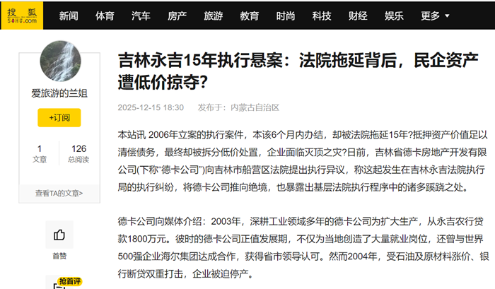 本站讯 2006年立案的执行案件,本该6个月内办结,却被法院拖延15年?抵押资产价值足以清偿债务,最终却被拆分低价处置,企业面临灭顶之灾?日前,吉林省德卡房地产开发有限公司(下称“德卡公司”)向吉林市船营区法院提出执行异议,称这起发生在吉林永吉法院执行局的执行纠纷,将德卡公司推向绝境,也暴露出基层法院执行程序中的诸多蹊跷之处。