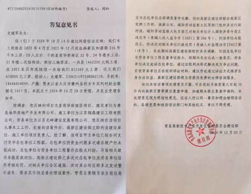 面对农民工的质疑,高新区建设部在答复意见书中称已采取多项措施:对总包、劳务单位进行信用考核处罚、全区通报,向企业总部发送警示函,管委会主要领导还亲赴南京调度案件化解,同时联合多部门约谈相关单位,城阳劳动监察大队也已介入并作出行政处罚。但在农民工看来,这些举措全是“空头文章”,史建军等农民工表示,每次反映问题,相关部门只会给出内容雷同的答复,连标点符号都不改,从未真正采取有效措施解决实际问题。