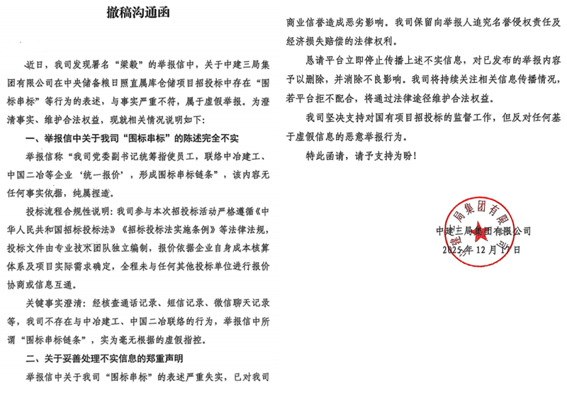 随后,中建三局集团有限公司发布一份简短说明,否认存在围标串标行为,称投标文件由专业技术团队独立编制,报价依据自身成本核算体系及项目实际需求确定,全程未与其他投标单位进行报价协商或信息互通,并声称已核查通话记录、短信记录、微信聊天记录等,不存在与中冶建工、中国二冶的联络行为,举报内容属"毫无根据的虚假指控"。同时,该公司表示举报信息已对其商业信誉造成恶劣影响,将保留追究举报人名誉侵权责任及经济损失赔偿的法律权利。