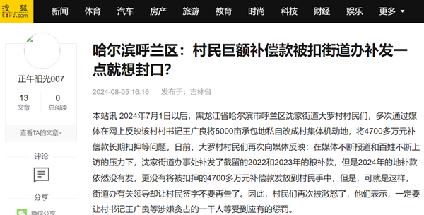 7月1 日,一篇题为《黑龙江:霸道村书记扣留千万村民补偿款 省领导签批至今未果》的贴文在网上迅速串红,之后,题为《黑龙江呼兰:问题村书记王广良被指扣留4000多万补偿款官方称已立案》等多篇文章紧跟着就火遍了网络,腾讯、搜狐、今日头条、网易等媒体进行了广泛报道。