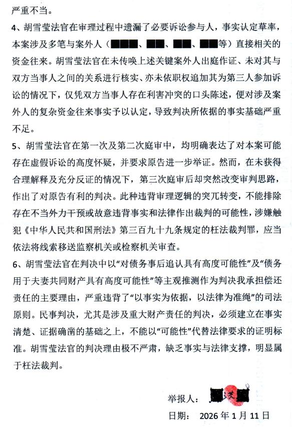 本站讯 近日,吉林省长春市民洪女士向市委巡察组提交实名举报材料,直指二道区法院法官胡某某在(2023)吉0105民初4535号民间借贷纠纷案件中存在枉法裁判行为,涉嫌包庇原告海先生与前夫明先生合谋的虚假诉讼,导致其离婚后合法分得的财产被法院强制执行,权益遭受重大侵害。