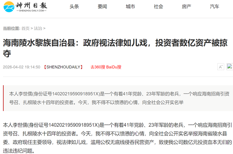 本人李世儒(身份证号14020219590918951X)是一个有着41年党龄、23年军龄的老兵,一个响应海南招商引资号召、扎根陵水十四年的投资者。今天,我不得不以愤懑的心情,向全社会公开实名举报海南省陵水县委、政府现任主要领导,视法律如儿戏,滥用公权无底线侵吞民营资产,致使我公司数亿元投资血本无归的违法违纪问题。