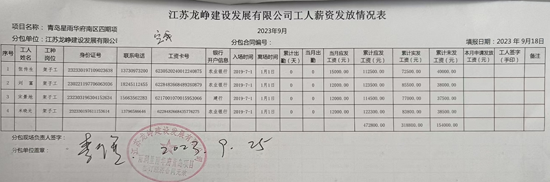 青岛高新区星雨华府南区的楼栋早已封顶落成,成为城市天际线的一部分,但为这片建筑挥洒汗水的近百名农民工,却从2022年工程结束起,踏上了漫长又无望的讨薪路。木工班组长史建军的记账本上,65万元欠薪数字被反复圈注,这是其带领20名工人完成22号、24号楼木工工作及21号楼二次结构施工后,被拖欠的劳动报酬——该班组应得146.22万元,仅在2022农历年底收到81.22万元。与他们一同遭遇欠薪的,还有周际群混凝土班组、张传生架子工班组等多个工种,其中混凝土班组被欠10.2436万元,架子工班组被欠15.4万元,各班组欠款汇总成150余万元的“血汗账单”,最长欠薪时间已逼近三年。