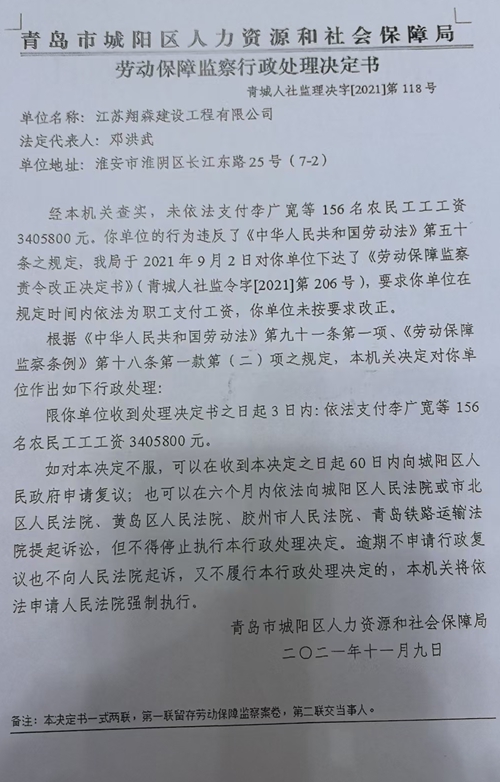 青岛高新区管委会建设部出具的信访答复意见书,早已证实了农民工们反映的欠薪问题。意见书明确,该项目建设单位为青岛地华房地产开发有限公司,总承包单位是江苏翔森建设工程有限公司,劳务分包为江苏龙峥建设发展有限公司,建设单位已按合同向总包单位付清工程款,但总包单位因资金问题多次申请破产未果,且与劳务单位存在工程量纠纷,最终导致农民工工资被长期拖欠。这本是权责清晰的欠薪事件,却因监管层面的严重缺位,成为难以破解的难题,而其中最核心的症结,便是农民工工资保证金制度的彻底落空。