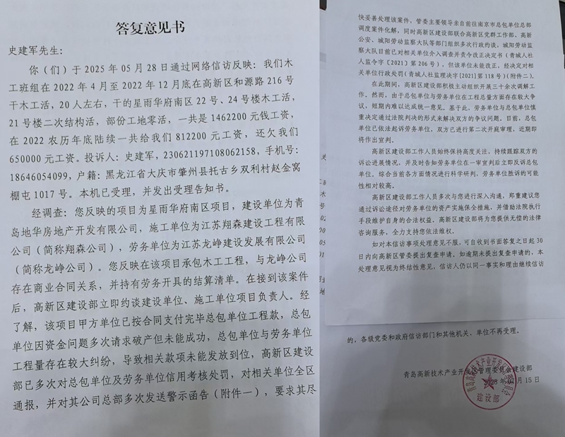 面对农民工的质疑,高新区建设部在答复意见书中称已采取多项措施:对总包、劳务单位进行信用考核处罚、全区通报,向企业总部发送警示函,管委会主要领导还亲赴南京调度案件化解,同时联合多部门约谈相关单位,城阳劳动监察大队也已介入并作出行政处罚。但在农民工看来,这些举措全是“空头文章”,史建军等农民工表示,每次反映问题,相关部门只会给出内容雷同的答复,连标点符号都不改,从未真正采取有效措施解决实际问题。